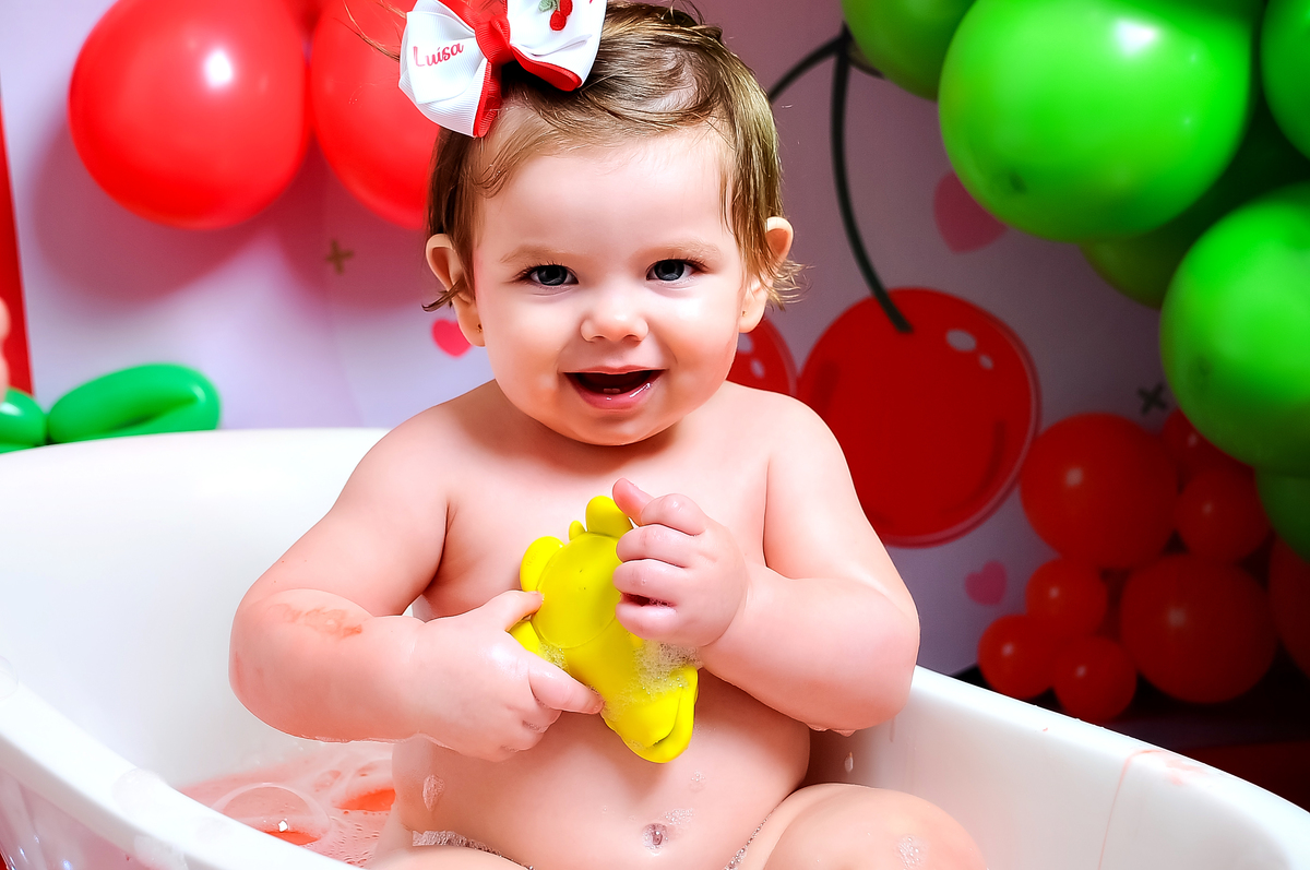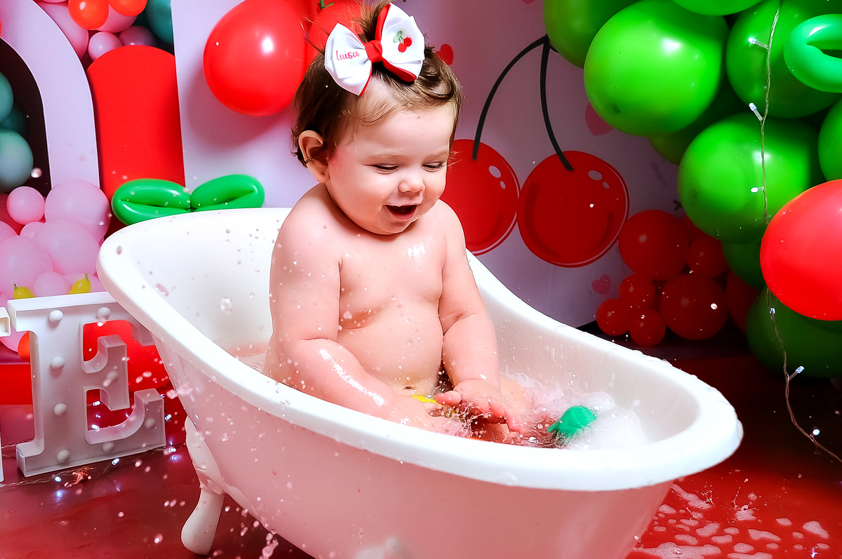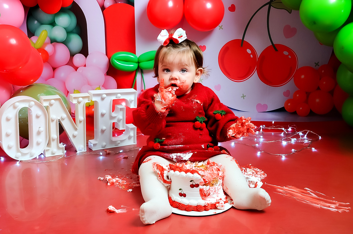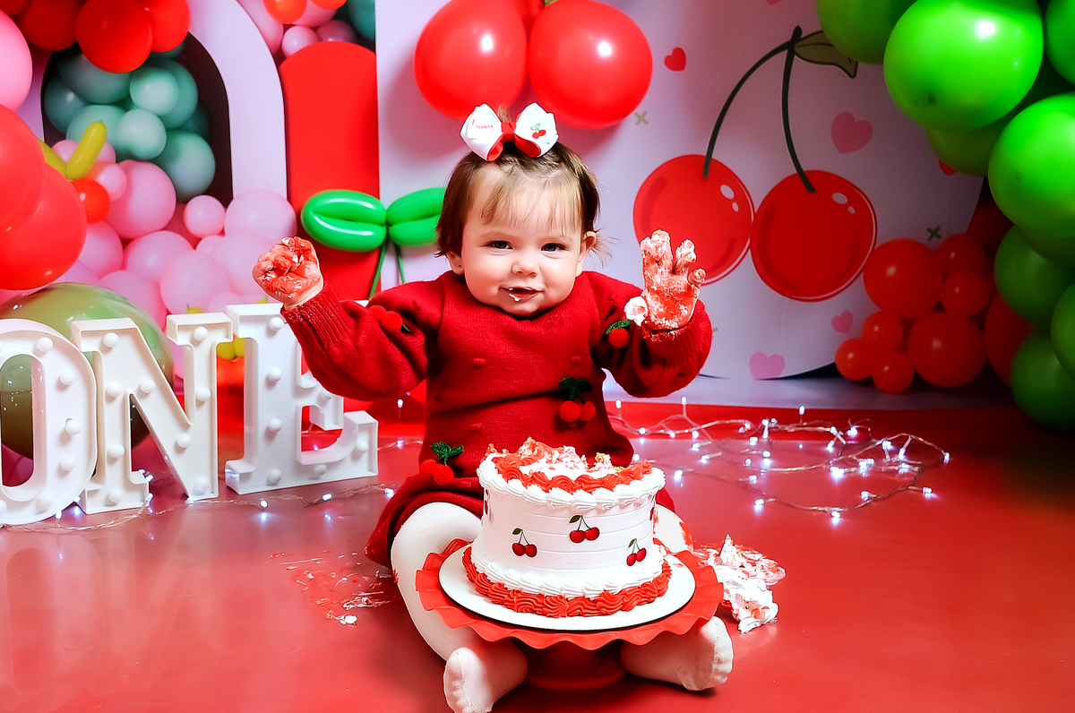 Acompanhamos cada fase desse primeiro aninho tão especial, e ver essa princesinha no seu ensaio de Smash the Cake com o tema cerejinha foi simplesmente delicioso (literalmente 🍰 rs).